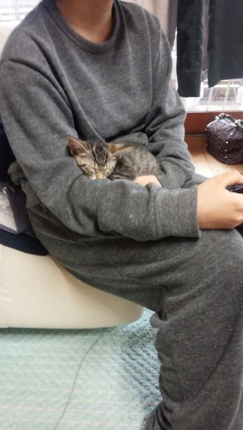 いつもそうしているように娘の膝で眠りました