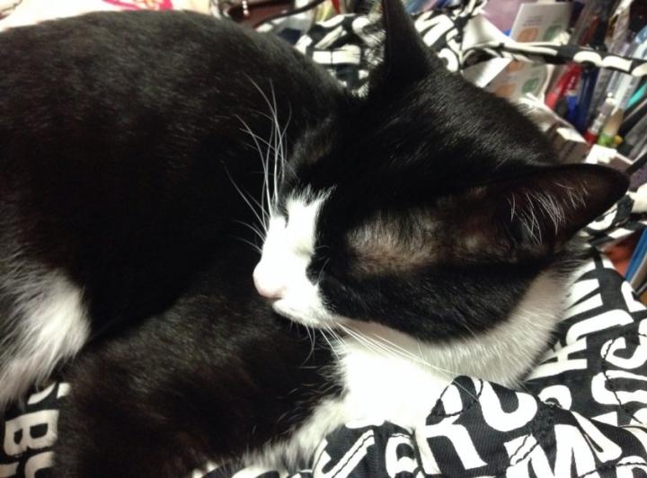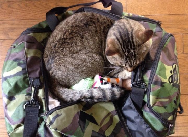 膝上でバッグ内の整理をしていてもお構いなし、よっこらせとばかりに乗ってくる雷。