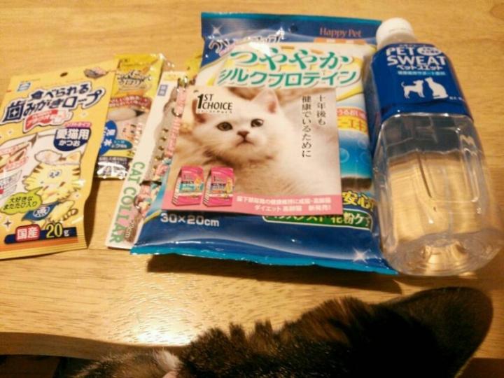 あと首輪と、歯磨きおやつと、使い捨てウエットボディタオルと、スープ状のごはん?みたいなもの。