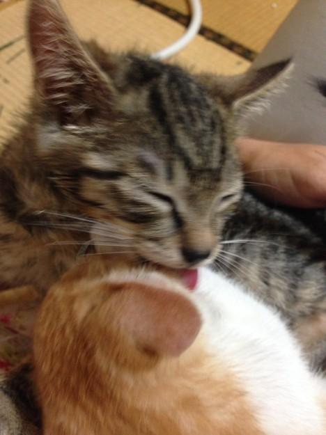 シーチキン缶をあさって油まみれになったのをなめ合う2匹。