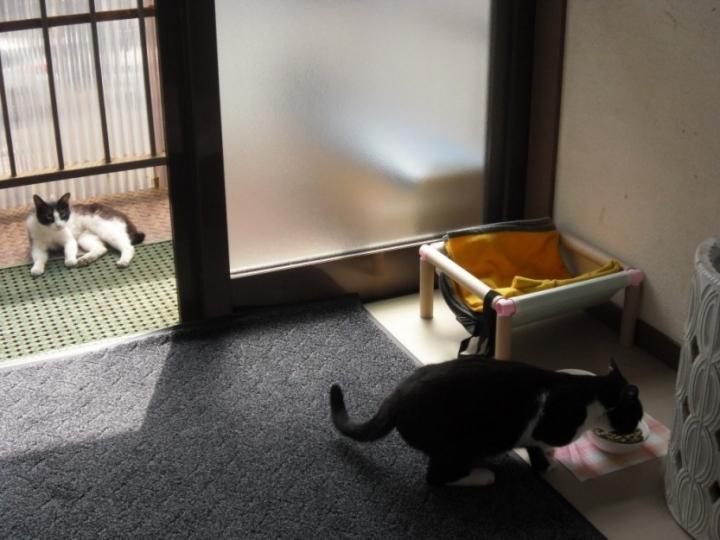 ということで、内側の扉を開け、外側をすべて閉め、猫たちのシルエットが見えたら出迎えに行くことにしました。