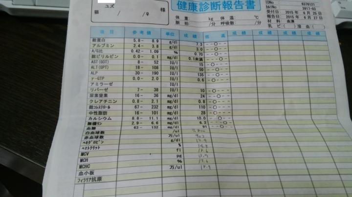 ゆずの血液検査の結果(6/25)をもらってきました。(全て問題なし)