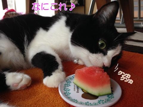ムスビも暑そうなので、今日はスイカを上げてみました。