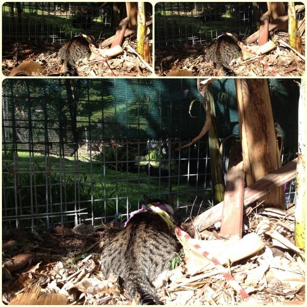 Rupiさんが 身を低くしてお隣のお庭を狙っています。