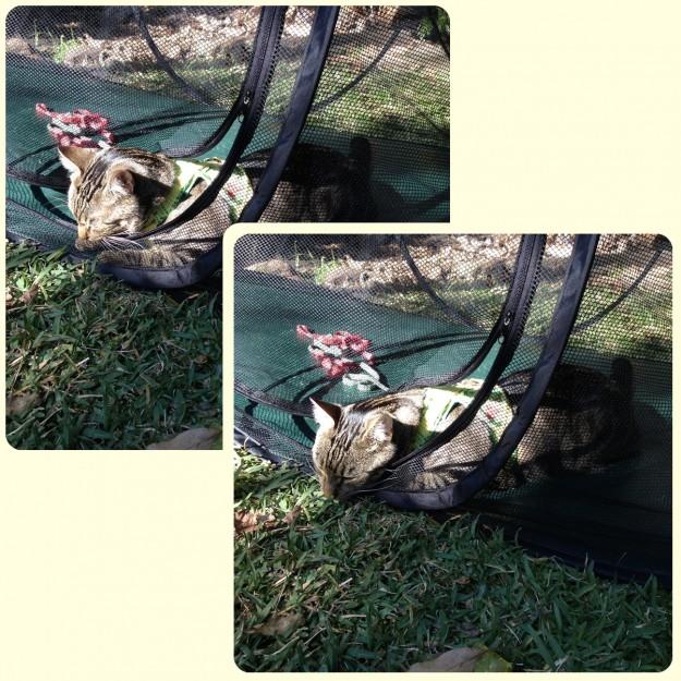 テントのチャックと格闘したり、ぐうたらに寝そべりながら 芝を食いちぎったりしてました。