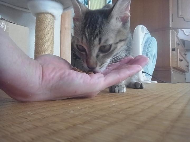 手のひらに、残ったキャットフードをのせてたら、きれいに食べてくれます。