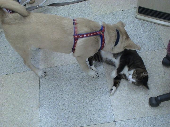 猫のレモンはいぬなれしているので犬の優お相手していますがときどき