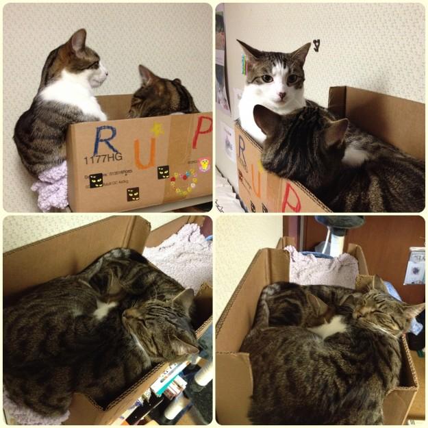 またもや ににゃんで 同じ箱ベッドに入っています。