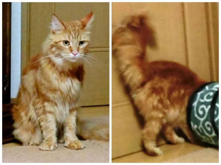 <ドライヤー直後のライア君。ソファーから立った私に「また、ドライヤー‽!」と慌ててキャットトンネルに潜り込む もう、終わりましたって^^;>