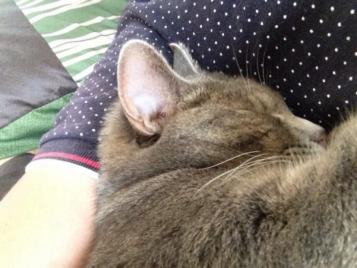 下僕の脇の下がお気に入りらしく、この猛暑のなかピッタリフィット…