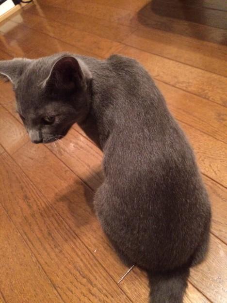 そして、テーブルの下に片付けてあるブラシを前足で落として、背中を向け、ブラッシングの催促。