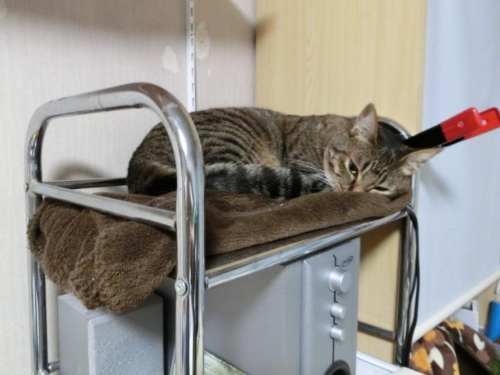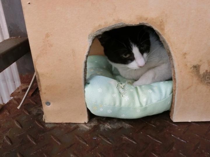 休み中は戸締りするので、いつもご飯を入れていく外の箱にベッドを入れた帰ったら、使ってくれていた♪