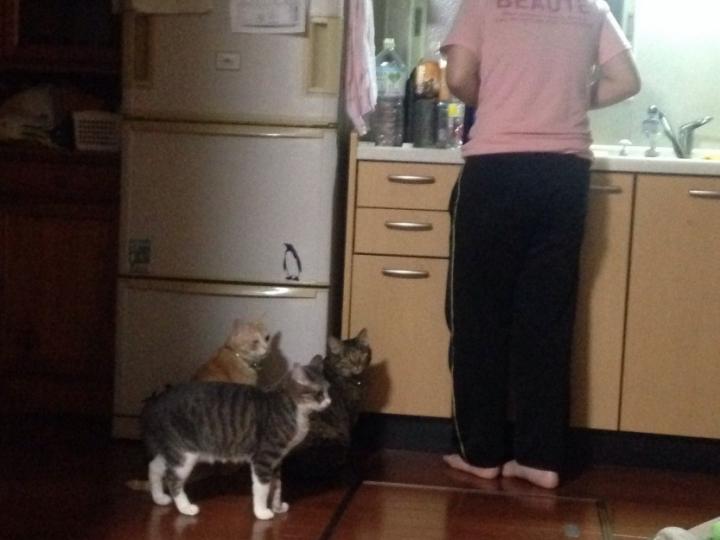 キッチンに立つ小さい姉ちゃんのもとにニャンず集結!