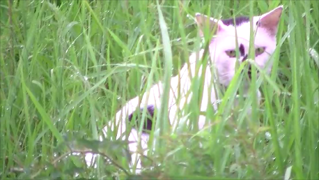 堤防下の草むらに身を隠し、老茶トラの動向をジッと伺う、