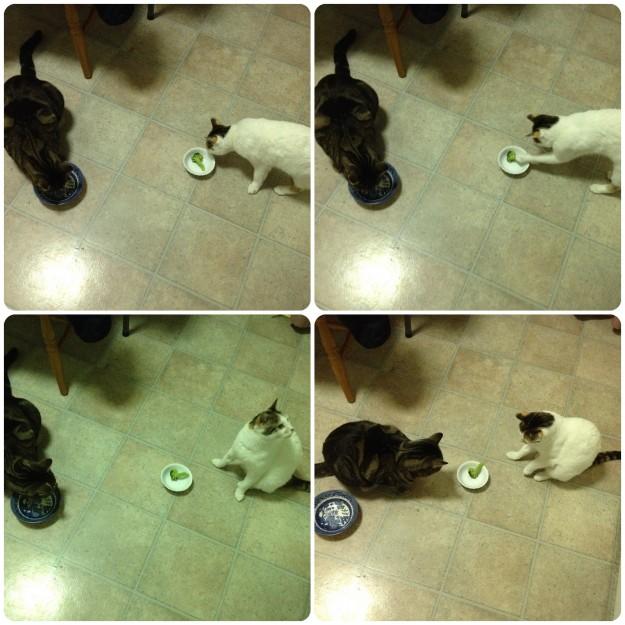 食べ物で意気投合している ににゃんに はい、どうぞ。