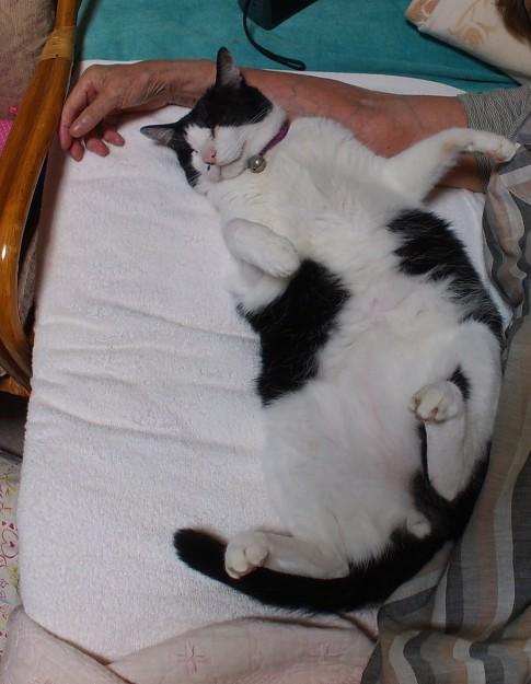お母ちゃんの腕枕で、機嫌よくお昼寝のハチ君。
