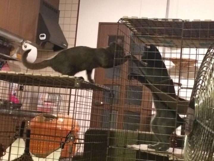 しかも、走り幅跳びみたいに、ひたすらダッシュ→ベッドの布団にバシュッ→ダッシュ→繰り返していて、ゼーハァゼーハァ言ってるので、ゲージに入れました(笑)