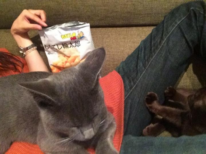 飼い主は寝ながらお菓子を食べるハメに(笑)