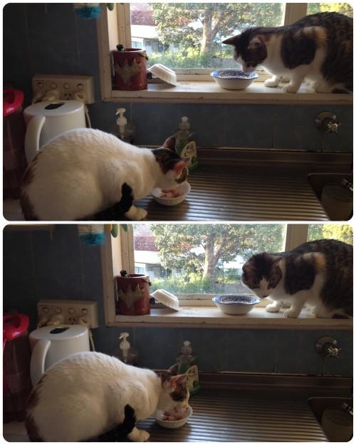 食べている時も AmiとEuron君(床)に目をやり 監視をしております(笑)