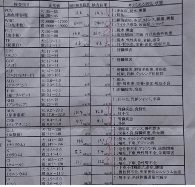 血液の成分、赤血球とたんぱくの数値が下がってるのは、輸液で血液が薄まってるからだそうです。
