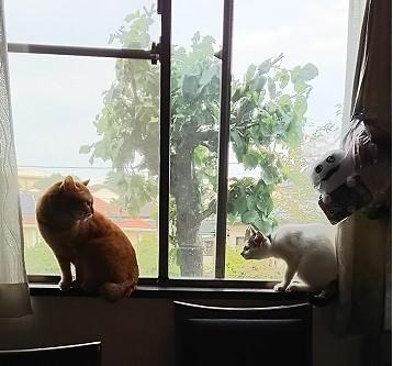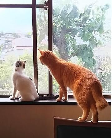 斑の後を追ったヒノエが窓枠に初挑戦。飛び降りれますが、帰り道をふさがれた感の斑は「なんだよ~」な感じの(シャーッ!)とご挨拶。手を出すわけではないので、そのうちヒノエは他を探索に。