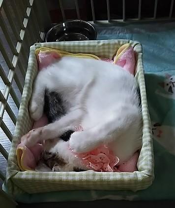 ヒノエ用のゲージにトイレを入れたら、せっかく段ボールで作ったベッドは入らず…。市販のベットも入らず…仕方ないのでお得意?のダイ○ソーでケース&端切れ布&ふわふわタオルでベッド作った(製作費324円♡)ら、気持ちよさそうに寝てくれました。へそ天でwww
