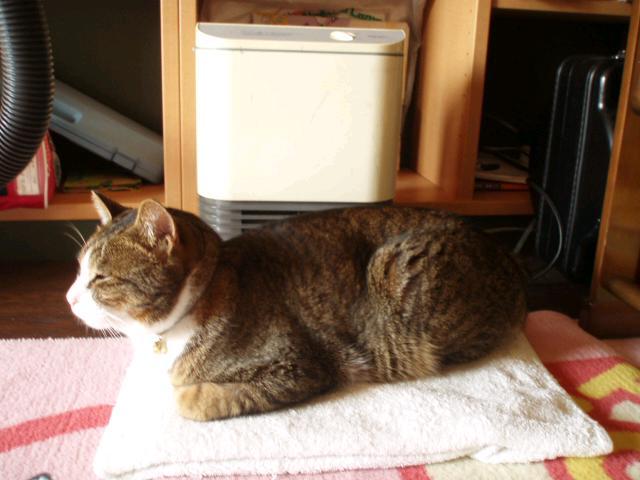 昨日は風が強くて寒かったね。だからチップ君もこうして温風ヒーターの前で寛いでいたよ。