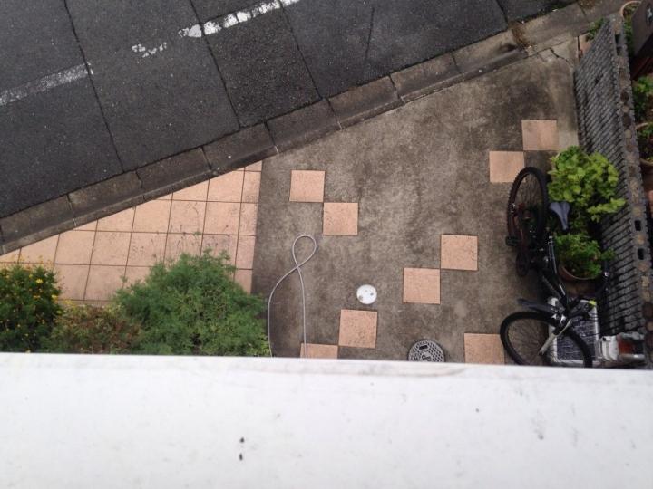 下を見ると 車の前に座って通行人を眺めてるハンちゃんの頭が見えた