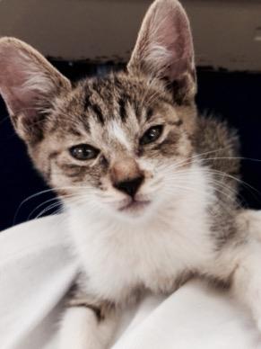 そして、翌日。その日は朝一の出勤なので職場のドアを開けようすると、「ミー、ミー」と鳴き声が。そうか、猫がいるんだったな。しかし、声からするとかなりチビ助だな。そして、中を見るとそこにはこの仔が。