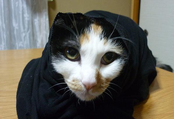 今日の猫は脱ぎっぱなしでテーブルに置いてあった