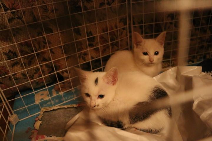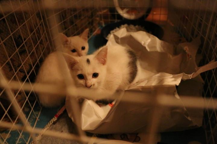 綺麗な白猫ちゃんで、片方の子は、おでこにちょこんと模様があるのがチャームポイントです。