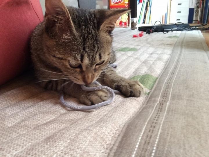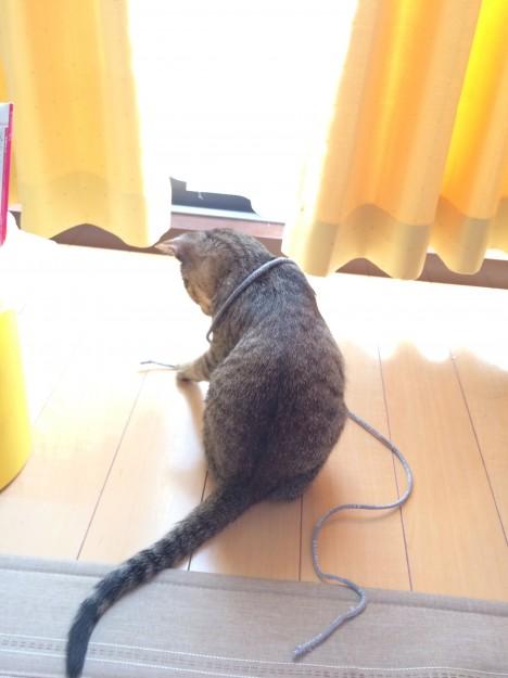 昨晩のことなど忘れたかのように紐で遊んでいます〜。