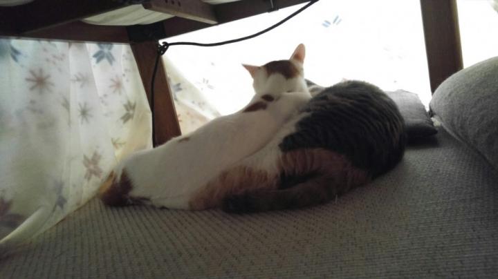 人間用こたつは毎年恒例、こたつ(仮)の状態(こたつ布団カバーのみかけた状態)です。