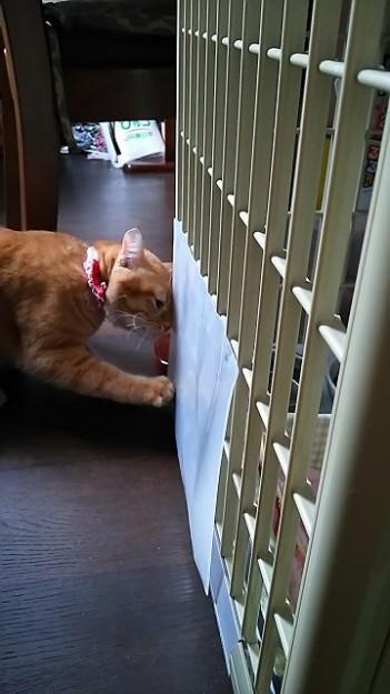 隙間に前足を入れられないように、一時的にクリアファイルをくっつけていたのですが…、