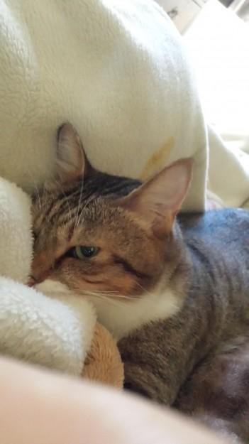 写真を撮ろうと近づくと、うっすら目を開けるドラニコ。