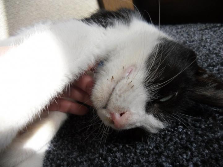 剥げた(というか、人と同じくカサブタを取ったらある痕のようなもの)二か所には、以前もべーさんやサナエに使ったことのある皮膚感染症治療剤なる軟膏を。