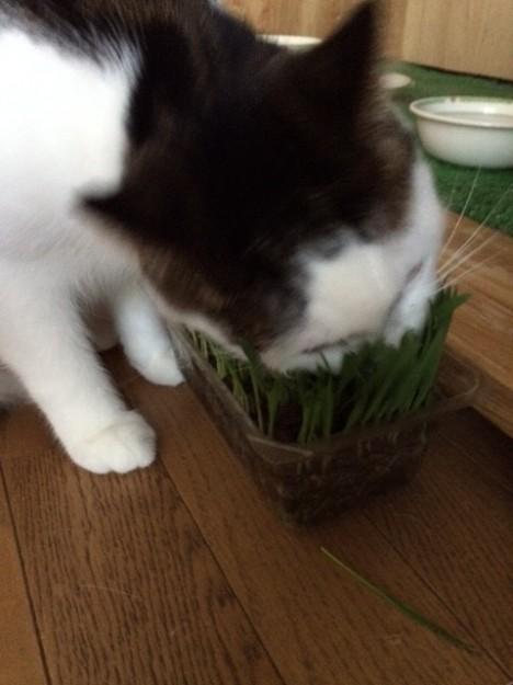 猫草大好き、草食♂のマロはがまんできずに食べてました。