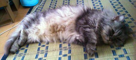仔猫時代は本当にフワフワの長毛で、尻尾なんかリスみたいに大きくて、成猫になればどんなゴージャスな猫になるんだろうと期待していたのですが、体は成長しても毛はあまり成長せず、中途半端な長毛、尻尾は毛は長いけど少ないのでサンマの開きみたいになっていました。