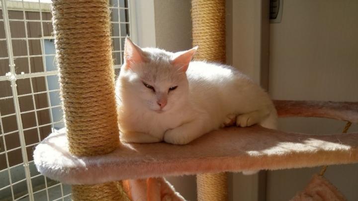 マリーちゃんが寝室のキャットタワーで日向ぼっこ中でした。
