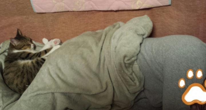 人のそばが好き、ソファが好き、着る毛布(ダンナさんが掛けてるやつ)が好きなので、こうなりました。