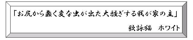 そんなある日の事。いつものように僕たちのトイレを掃除していたゲンさん、ウンチに白い米粒のような物が付いているのを見つけたんだ。カリカリしか与えてないのに何を食べたのかなって思ったらしいよ。そして掃除を続けているとまた別のウンチに同じ物がくっ付いていたんだね。でもね今度はそれが伸びたり縮んだりしたんだ。