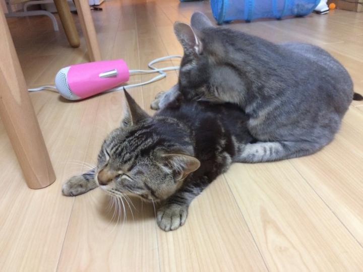 先住猫ごまのすけ君にぺろぺろしてもらってます。