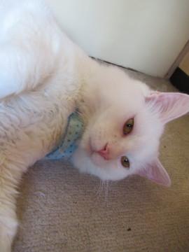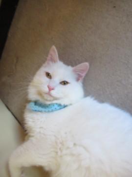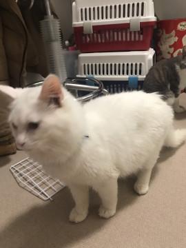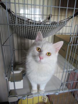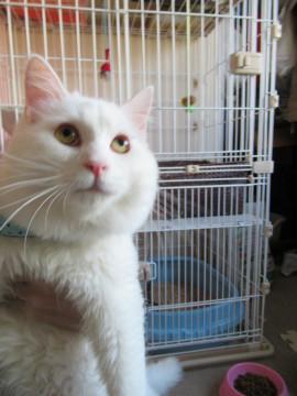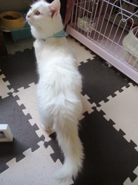 真っ白な長毛で、恐らく洋種と和猫のミックスではないかと思われます。しっぽが長くフサフサです。