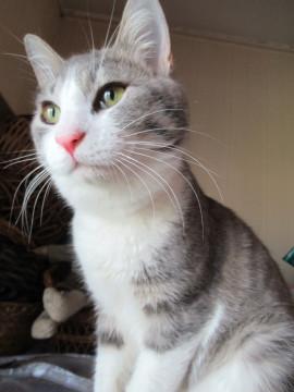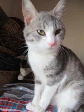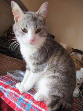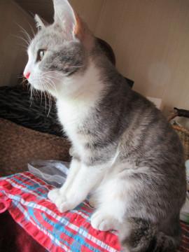 サバ白でグレーに少し薄茶が混じったような変わった毛色です。恐らく洋種と和猫のミックスではないかと思われます。しっぽは長いですが、先端が少し丸まっています。