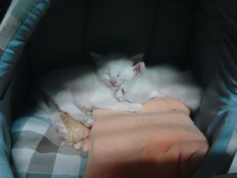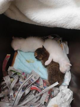 4月13日保護 空き家の押し入れの中で発見されました。3匹姉妹で、白2・キジ1です。