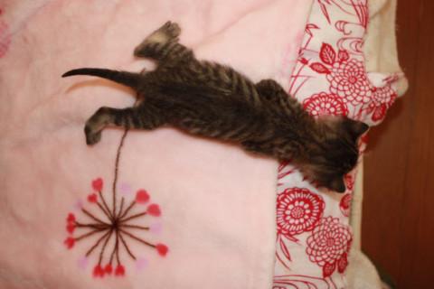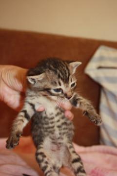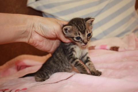 かわいいキジトラ、あざぜる君です。まだ小さいので性格ははっきりわかりませんが、ミルクから育てているので大変人懐こくなります。元気で活発です。