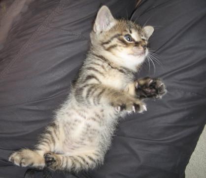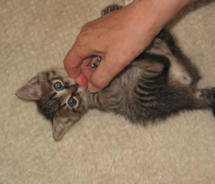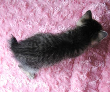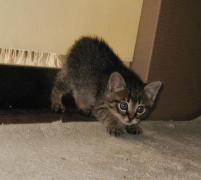 黒い縞模様がくっきりしたキジトラで、短い尻尾をフリフリする様子がかわいいです。トイレにきちんと排便できますが、時々トイレの周りに敷いたトイレシートにオシッコをしてしまうことも。トイレの掃除が行き届いていないと苦情を言いたいのかも。徐々に粗相はなくなっています。オモチャで遊んだり、我が家のネコ達にじゃれついたりよく遊びます。餌は子ネコ用のドライフードを最初はミルクでふやかしましたが、最近はそのままカリカリと食べます。他に子ネコ用のカルカンパウチのマグロやタイ、シーバの子ネコ用おやつなど。