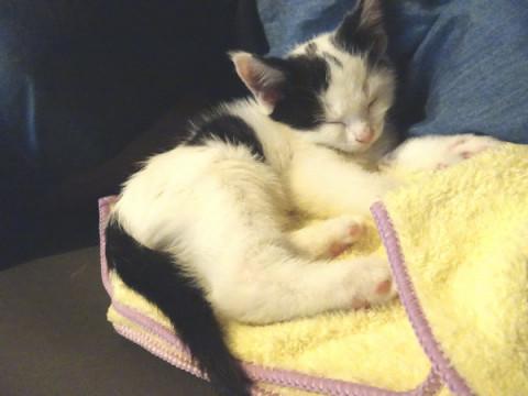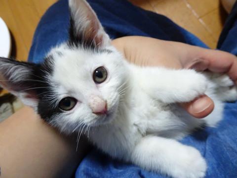 小学校の校庭で丸1日以上鳴いていたため、親からはぐれたか人に捨てられたと判断して保護し、里親募集をすることにしました。