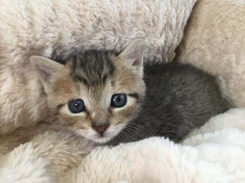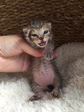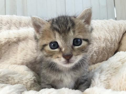 器量の良いお顔をしています。目はパッチリ、お耳も大きくなってきました。尾は長めで、毛色はキジトラです。