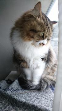 ノルウェージャン風な存在感ある外観に似合わず、小心で控えめな性格です。臆病なところはありますが、人に撫でられることが大好きで、すぐにゴロゴロと喉を鳴らします。ですが、高い位置から見下ろされたり、大きな音を立てられたりすると怖がってケージに戻ります。